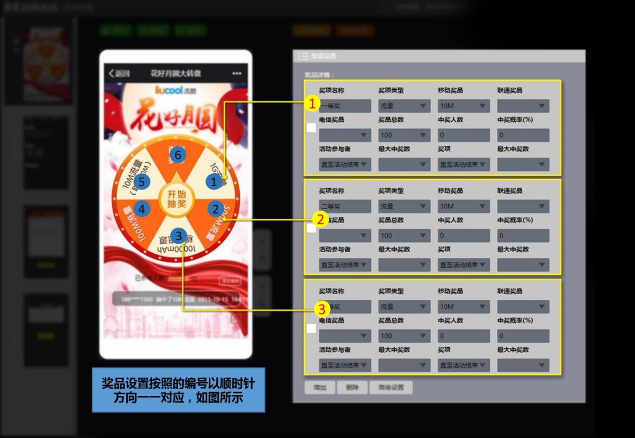 Step6:奖项设置,根据需求设置奖项名称,奖品类型、奖品总数、奖品概率等相关事项(奖项设置需对应转盘奖品的位置)如图: