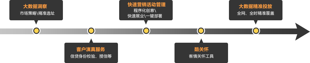 通过客户身份特征、消费行为、位置信息、社交活动这四维一体的核心大数据,基于大数据高度融合,以此为基础可提供大数据洞察(市场策略\精准选址)、客户演真服务、快速营销活动管理、酷关怀客情关怀工具、大数据精准投放等营销服务。