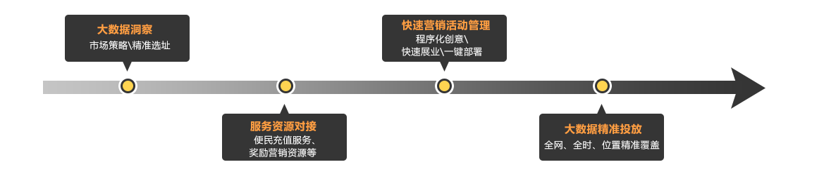基于运营商海量LBS定位数据,帮助客户了解店铺所在商圈竞争报告及营销服务,通过便民充值服务、场景化营销、奖励资源接入,助力品牌营销闭环和O2O模式升级。
